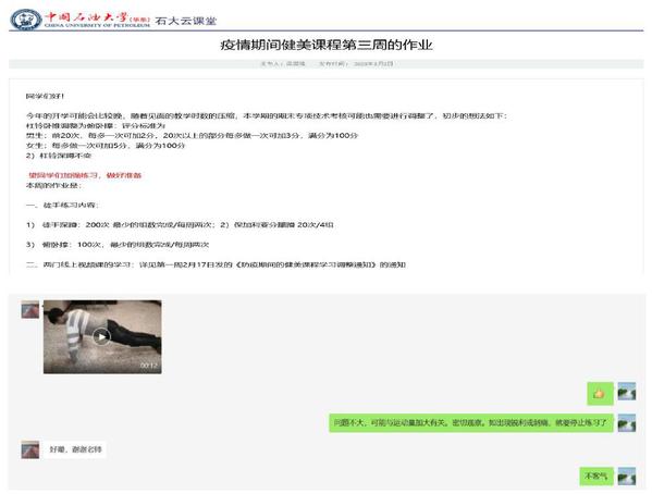 “采用哪种平台进行线上教学,教学形式是直播、录播、训练计划、图片等,教师如何监督学生的居家锻炼效果”,本次视频会议,青年教师就近期线上教学中遇到的问题及经验进行了交流和探讨。二公体主任尤洋示范了爱课程、OBS等软件平台的功能及使用方法,要求对学生线上学习加强督促,并对教学效果做好记录,确保线上教学取得良好教学效果。