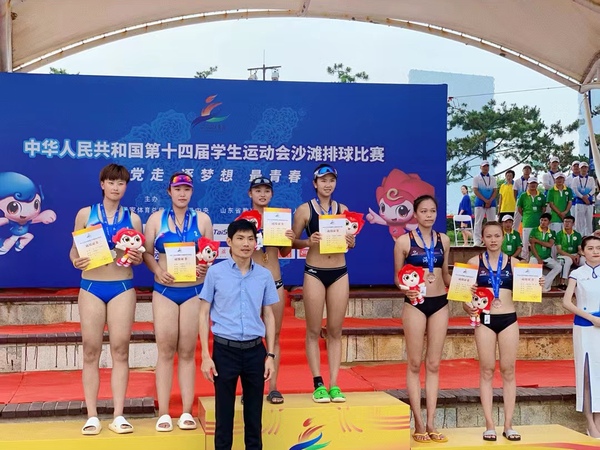 在全运会女子沙滩排球比赛中,我校女排队员姜晓婧和中国海洋大学运动员李玥代表山东获得女子沙滩排球大学组银牌。