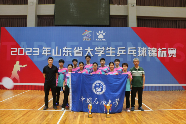 2023年6月3日至8日,山东省大学生乒乓球锦标赛在青岛职业技术学院举行。我校高水平乒乓球队由高千里、张帆教练带队,共派出5名男队员和5名女队员参加比赛,经过激烈角逐,我校取得了学校团体总分一等奖的好成绩。
