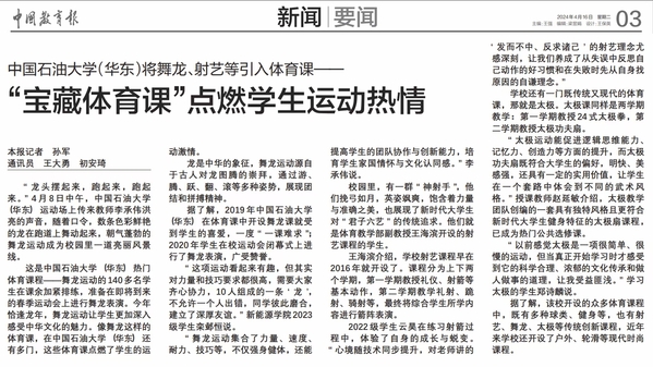 2024年4月16日,《中国教育报》以中国石油大学(华东)将舞龙、射艺等引入体育课--“宝藏体育课”点燃学生运动热情为题报道我校体育工作。近年来betway88西汉姆联开设学生喜爱的射艺、舞龙、太极等创新且具有传统文化特色的体育课,还开设户外、轮滑等现代时尚课程,引领学生强身健体,受到学生的广泛好评和喜爱,经验做法得到新闻媒体的关注。