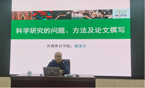 骆秉全教授以“科学研究的重要性、科学研究的一些基本问题、如何进行科学研究、科学研究的选题与主要研究方法、科学研究的成果和论文的写作”为提纲展开学术分享。讲座伊始,骆教授通过生动案例引出科学研究的重要性,指出科学研究是认识世界改造世界主要途径,同时,研究工作具有继承性、创造性、探索性、艰巨性、复杂性、集体性、一次性和连续性等特征。骆教授强调了科学与技术的区别与联系,指出科学的任务是认识客观事物,揭示事物的真相和原理,提高人类的认识水平,而技术则是根据科学原理或实验实践经验发明和变革现实的方法、措施和途径。随后,骆教授结合竞技体育阐释了现代科学技术的发展特点。接着,骆教授过渡到体育科学研究的范畴、特点与基本问题,对体育科学研究的问题、方法及论文撰写进行心得分享。