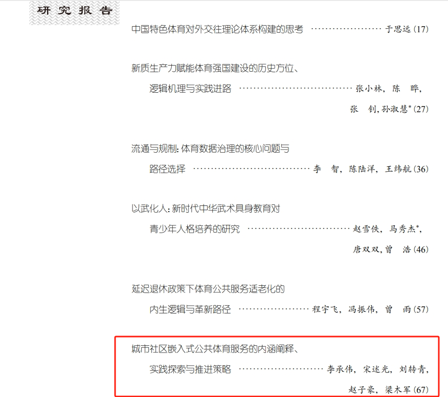 近日,我部教师李承伟博士团队在体育学领域权威期刊《体育科学》2025年第2期发表题为《城市社区嵌入式公共体育服务的内涵阐释、实践探索与推进策略》的研究成果,该研究在国家政策指引下,系统阐释城市社区嵌入式公共体育服务的内涵特征,梳理国内政策演进脉络,总结地方实践经验与现实困境,并提出推进策略。