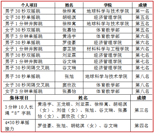 我校跳绳队由betway88西汉姆联张帆老师带队,共派出15名运动员参加比赛。运动员们克服困难,利用午休时间进行集体训练。虽然队伍组建时间不久,但是团队氛围以及队员之间的默契程度日趋成熟,比赛成绩皆优于日常训练成绩。在比赛中选手们挥洒汗水,以绳会友,展现着作为中石大学子的体育风采,最终取得了团体总分第四名的优异成绩。
