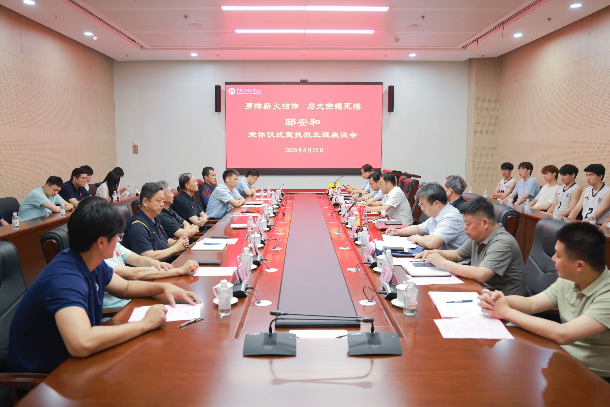 6月25日,学校男排终身荣誉教练邸安和荣休仪式暨执教生涯座谈会举行。党委书记吴强明出席并讲话,党委副书记马国顺主持仪式,学校相关部处负责人与师生代表参加。自2016年4月受聘为学校男排主教练以来,邸安和教练以深厚的职业素养和育人者的赤诚情怀,倾注于石大排球运动,带队实现了从蓄势待发到问鼎巅峰的辉煌跨越。十年间,带队取得了世界比赛季军2个、全国冠军4个、全国分区赛冠军5个的骄人战绩,实现中国大学生排球联赛总决赛“三连冠”。