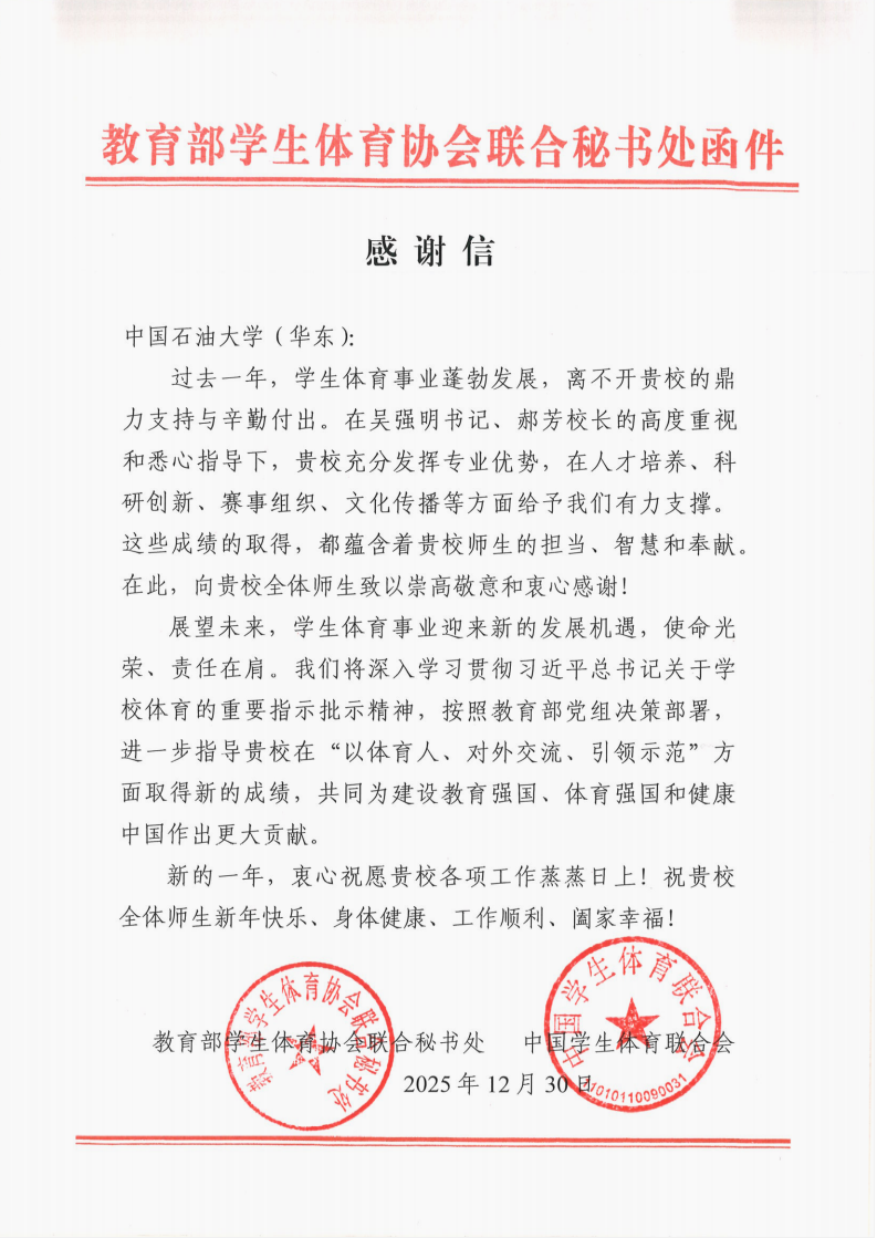 12月30日,教育部学生体育协会联合秘书处、中国学生体育联合会向我校发来感谢信,对我校过去一年在学生体育工作中的突出贡献给予高度评价。信中指出,在吴强明书记、郝芳校长的高度重视和悉心指导下,我校充分发挥自身专业优势,主动担当作为,在人才培养、科研创新、赛事组织、文化传播等方面为学生体育事业发展提供了有力支撑。