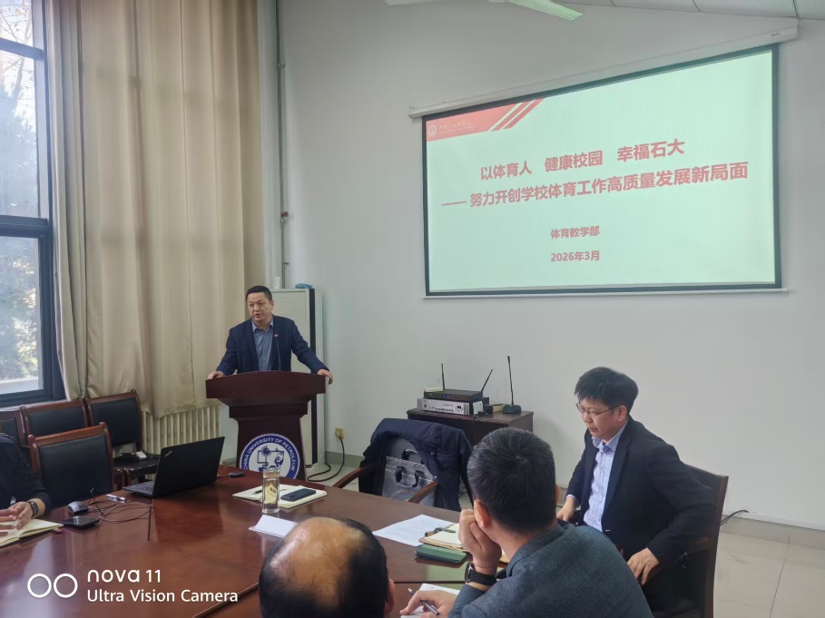 周伟主任以《以体育人 健康校园 幸福石大——努力开创学校体育工作高质量发展新局面》为题做“十四五”工作总结和“十五五”发展规划报告。总结全面回顾了体育部“十四五”期间在党建思政、师资队伍建设、人才培养、竞技体育、群众体育、科研创新和场馆建设等方面取得的突破性进展,同时分析了“十五五”时期在人才队伍建设、人才培养、专业建设等方面面临的机遇与挑战,并对下一阶段重点任务进行了系统部署。
